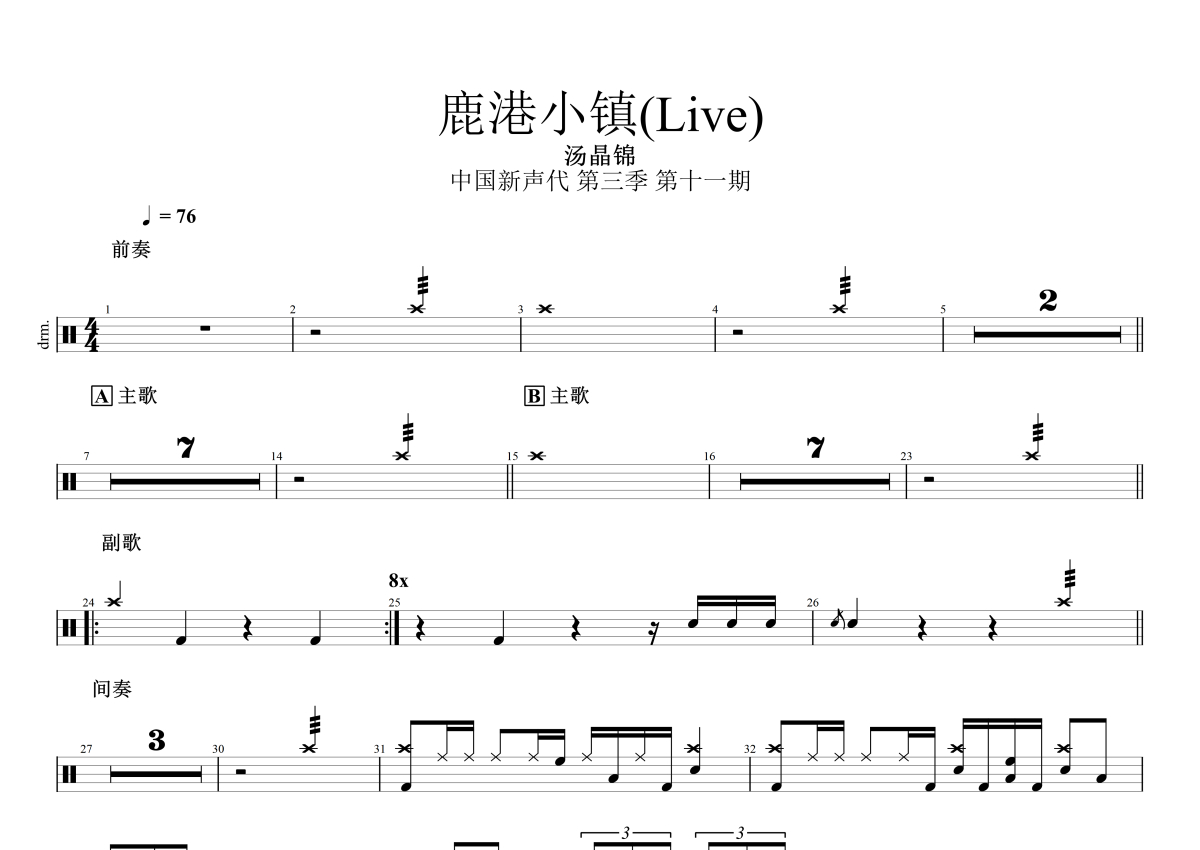 汤晶锦《鹿港小镇》鼓谱 - 架子鼓谱 - 中国新声代Live版