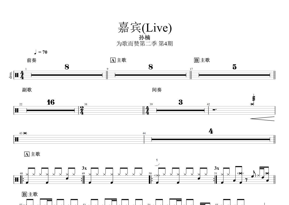 孙楠《嘉宾》鼓谱 - 架子鼓谱 - 为歌而赞Live版