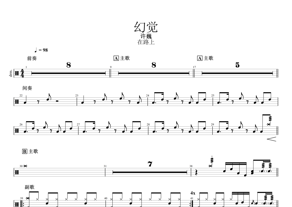《幻觉》是许巍演唱的一首歌曲,这份鼓谱共有两张高清图谱,图谱由 @打鼓谱 编配上传,图谱使用五线谱编配,使用这份幻觉架子鼓谱,你将能够轻松地敲打出这首许巍的幻觉,快来尝试吧。