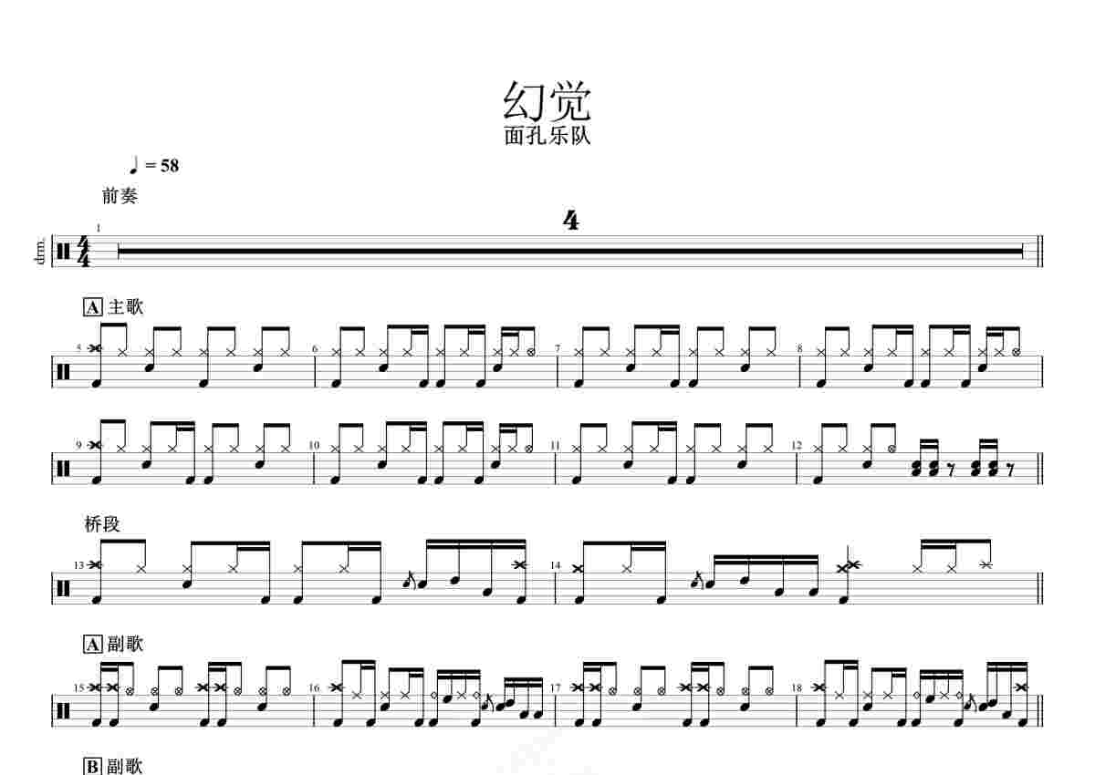 《幻觉》是面孔乐队演唱的一首歌曲,原版,这份鼓谱共有三张高清图谱,图谱由 @打鼓谱 编配上传,图谱使用五线谱编配,使用这份幻觉架子鼓谱,你将能够轻松地敲打出这首面孔乐队的幻觉,快来尝试吧。网上都是乐夏Live版,这个是原版。
