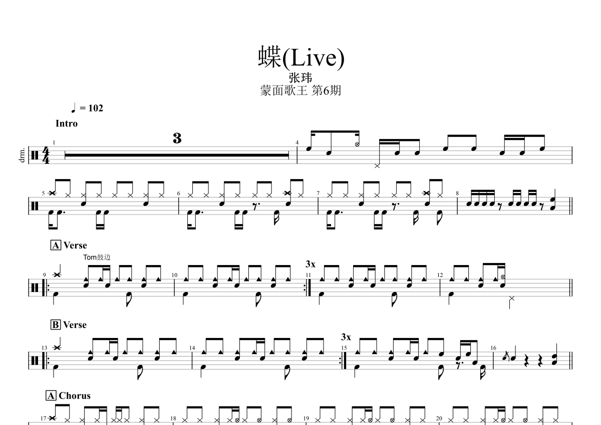 张玮《蝶》鼓谱 - 架子鼓谱 - 蒙面歌王Live版