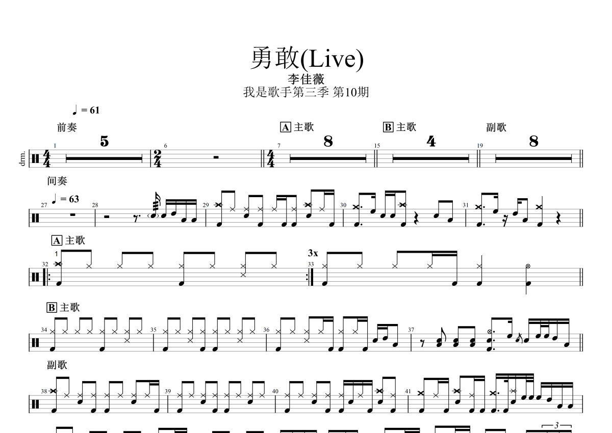 李佳薇《勇敢》鼓谱 - 架子鼓谱 - Live