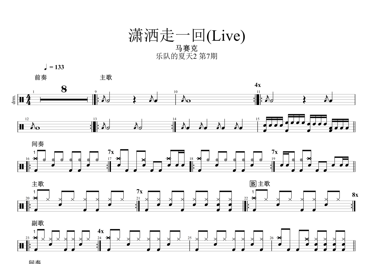 马赛克乐队《潇洒走一回》鼓谱 - 架子鼓谱 - Live