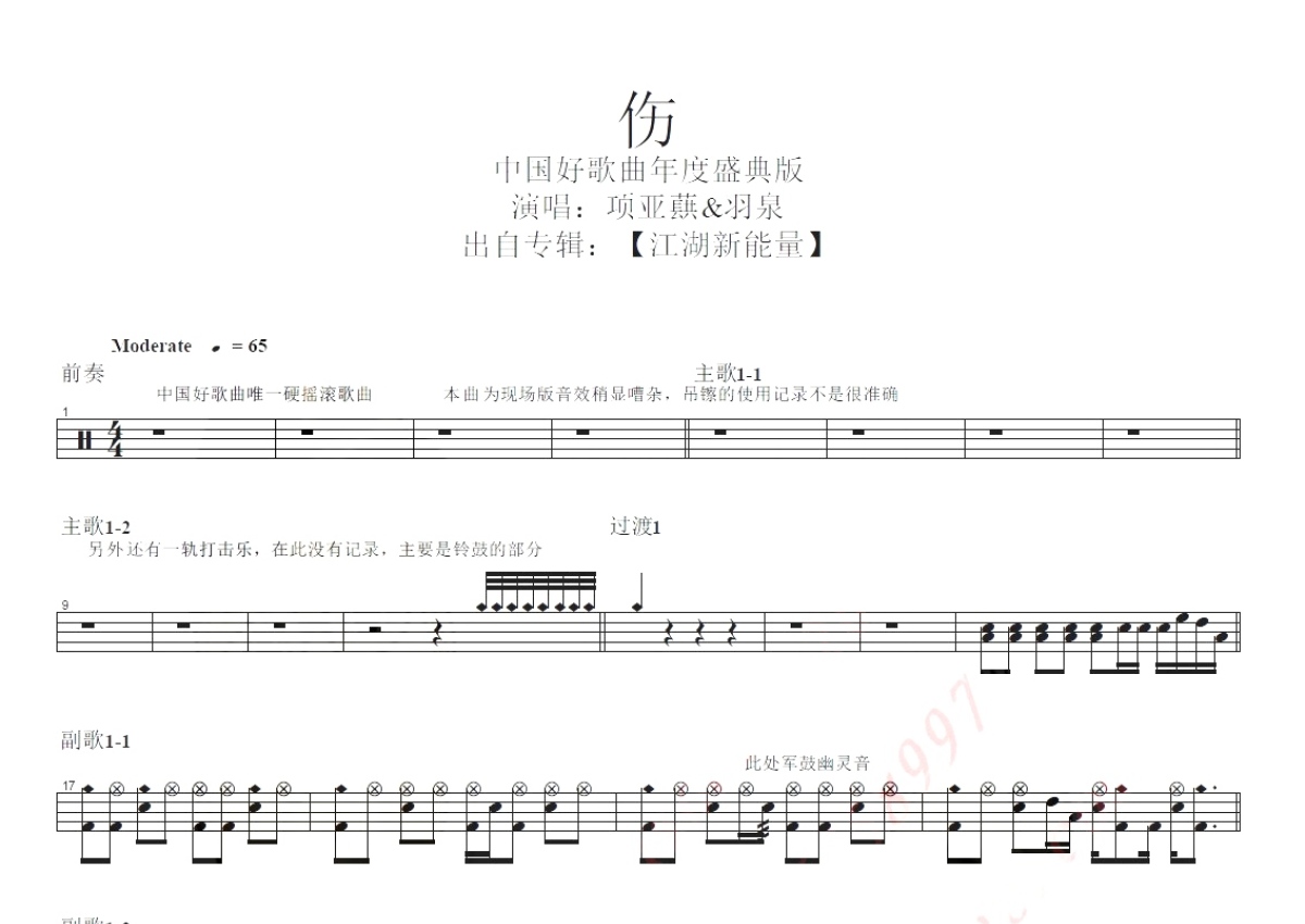 项亚蕻&羽泉《伤》鼓谱 - 架子鼓谱 - lIve