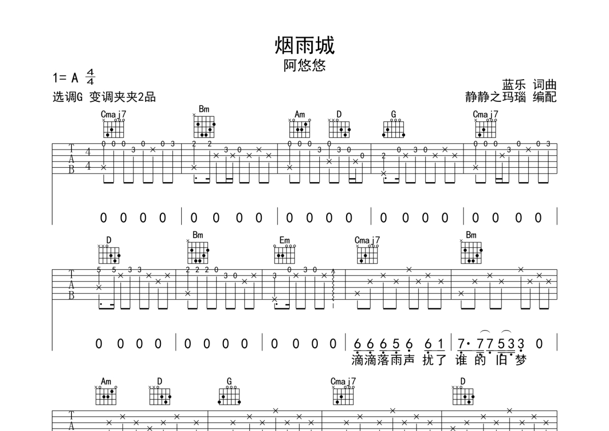 阿悠悠《烟雨城》吉他谱 - G调弹唱六线谱