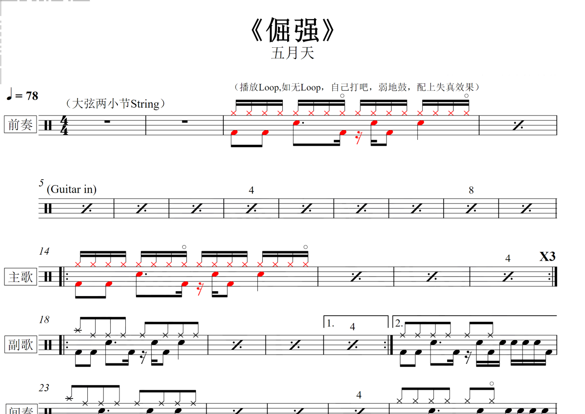 《倔强》是五月天演唱的一首歌曲,这份鼓谱共有两张高清图谱,图谱由 @打鼓谱 编配上传,图谱使用五线谱编配,使用这份倔强架子鼓谱,你将能够轻松地敲打出这首五月天的倔强,快来尝试吧。