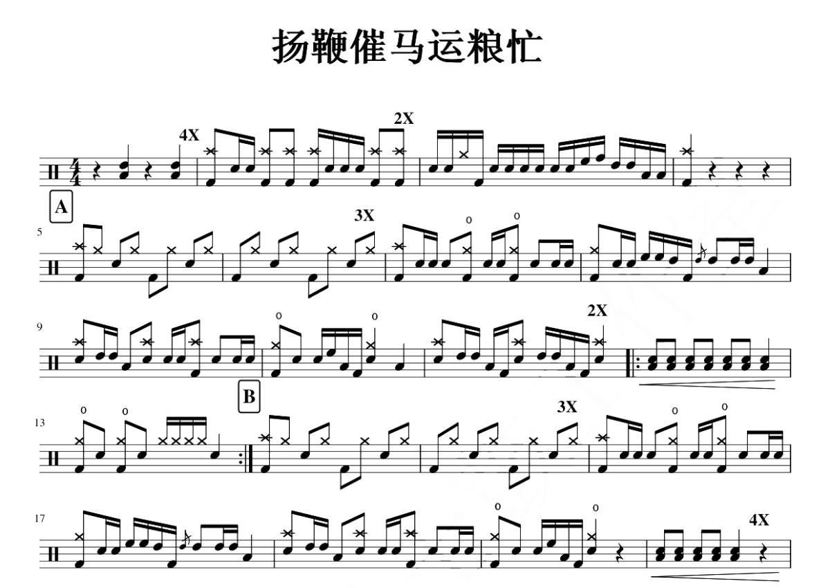 《扬鞭催马运粮忙》是魏显忠演唱的一首歌曲,这份鼓谱共有两张高清图谱,图谱由 @打鼓谱 编配上传,图谱使用五线谱编配,使用这份扬鞭催马运粮忙架子鼓谱,你将能够轻松地敲打出这首魏显忠的扬鞭催马运粮忙,快来尝试吧。《扬鞭催马运粮忙》是魏显忠创作于1969年10月的一首笛子独奏曲。该曲根据东北民间音乐风格创作,是新派笛子的代表乐曲之一。乐曲热情明快,以生动朴实的音乐语言,描写丰收以后的农民驾着满载粮食的大车,喜气洋洋地向国家交售公粮的情景。马蹄击节,车轮吟唱,快乐的农夫扬鞭催马,把丰收的喜悦铺撒在运粮的小道上。