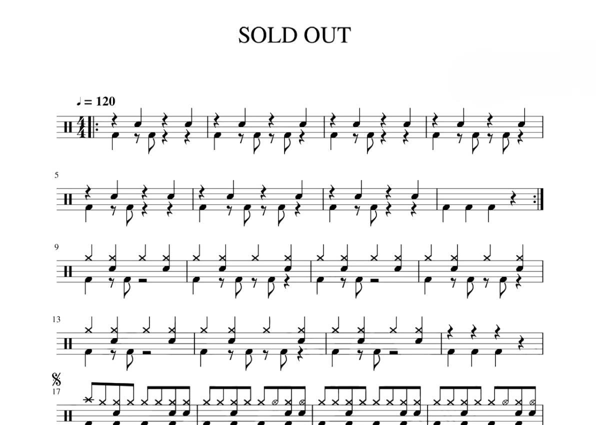 《Sold Out》是Hawk Nelson演唱的一首歌曲,这份鼓谱共有两张高清图谱,图谱由 @打鼓谱 编配上传,图谱使用五线谱编配,使用这份Sold Out架子鼓谱,你将能够轻松地敲打出这首Hawk Nelson的Sold Out,快来尝试吧。Sold Out收录于Hawk Nelson的第七张录音室专辑 《Diamonds》,于2015年03月17日正式发行。