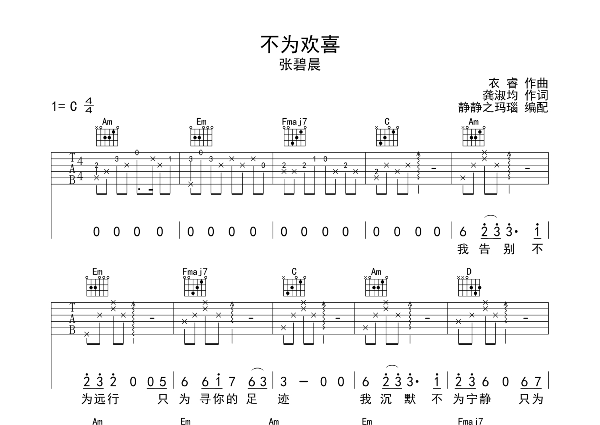张碧晨《不为欢喜》吉他谱 - C调弹唱六线谱