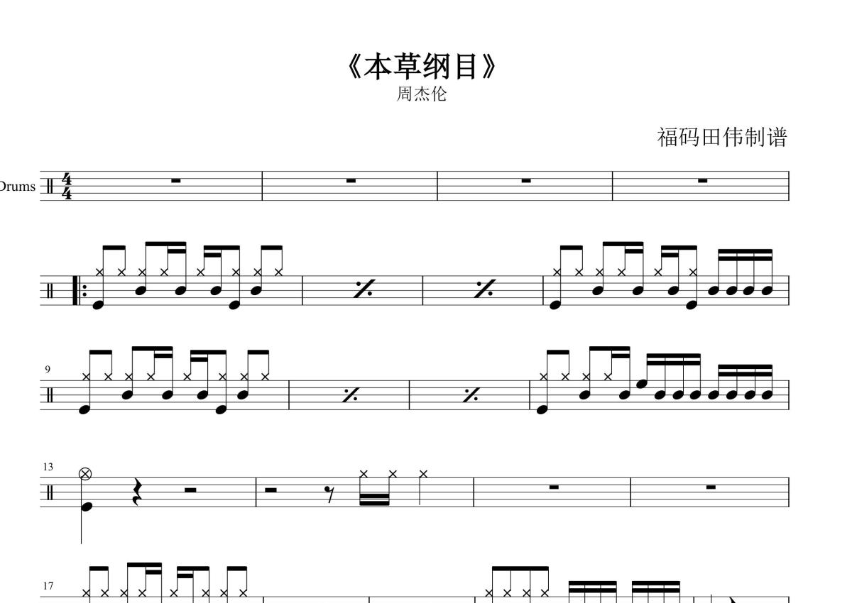 《本草纲目》是周杰伦演唱的一首歌曲,这份鼓谱共有两张高清图谱,图谱由 @田伟制谱工作室 编配上传,图谱使用五线谱编配,使用这份本草纲目架子鼓谱,你将能够轻松地敲打出这首周杰伦的本草纲目,快来尝试吧。《本草纲目》是周杰伦演唱的一首歌曲,由方文山作词,周杰伦作曲,林迈可编曲,收录在周杰伦2006年9月5日发行的专辑《依然范特西》中。 [2] 周杰伦在2009年春节联欢晚会上与宋祖英以“英伦组合”合唱该歌曲。