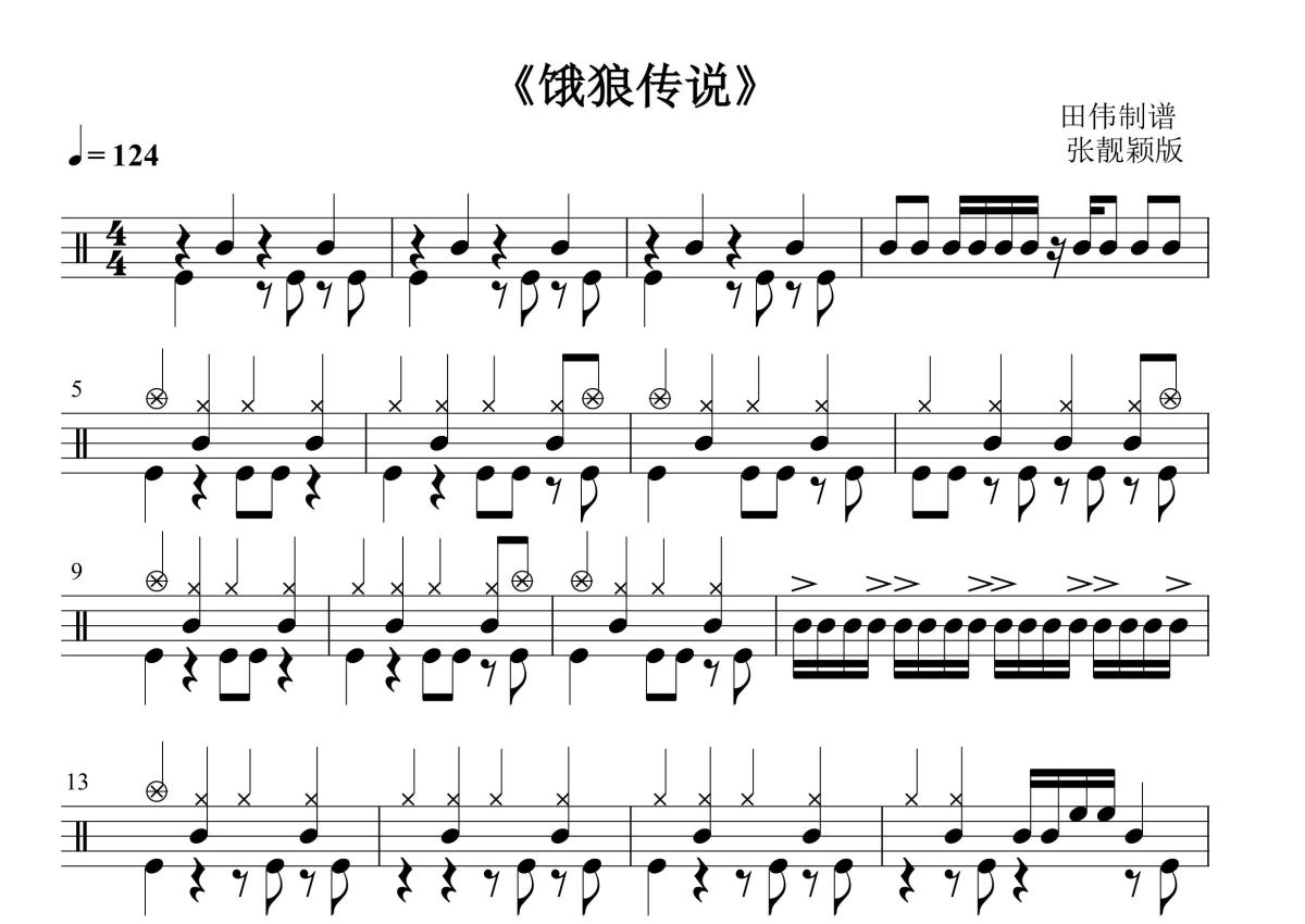 《饿狼传说》是张靓颖演唱的一首歌曲,这份鼓谱共有四张高清图谱,图谱由 @田伟制谱工作室 编配上传,图谱使用五线谱编配,使用这份饿狼传说架子鼓谱,你将能够轻松地敲打出这首张靓颖的饿狼传说,快来尝试吧。《饿狼传说》是中国内地女歌手张靓颖于《我是歌手第三季》第二期中翻唱的张学友名曲。