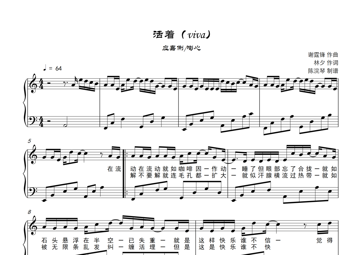 应嘉俐/嘭心《活着viva》钢琴谱 - C调钢琴谱,附歌词