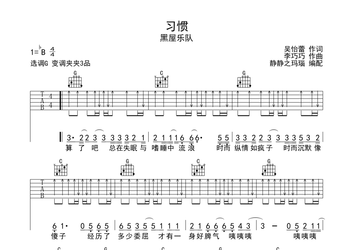 黑屋乐队《习惯》吉他谱 - G调弹唱六线谱