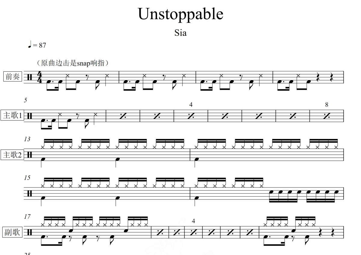 Sia《unstoppable》鼓谱 - 架子鼓谱