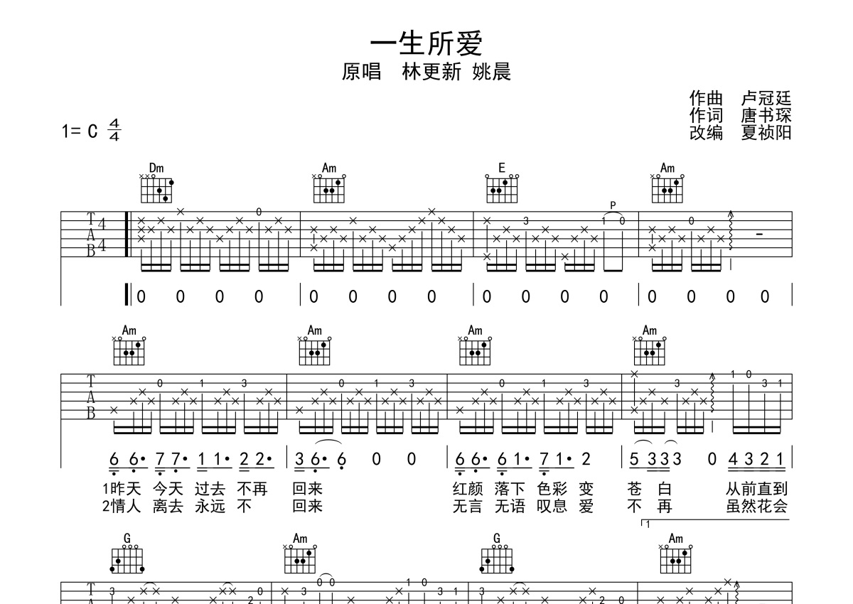 林更新/姚晨《一生所爱》吉他谱 - C调弹唱六线谱 - 《大话西游》主题曲