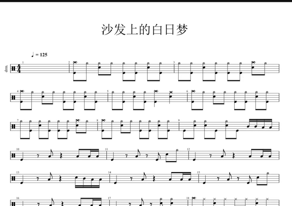 《沙发上的白日梦》是灵魂沙发演唱的一首歌曲,这份鼓谱共有三张高清图谱,图谱由 @打鼓谱 编配上传,图谱使用五线谱编配,使用这份沙发上的白日梦架子鼓谱,你将能够轻松地敲打出这首灵魂沙发的沙发上的白日梦,快来尝试吧。