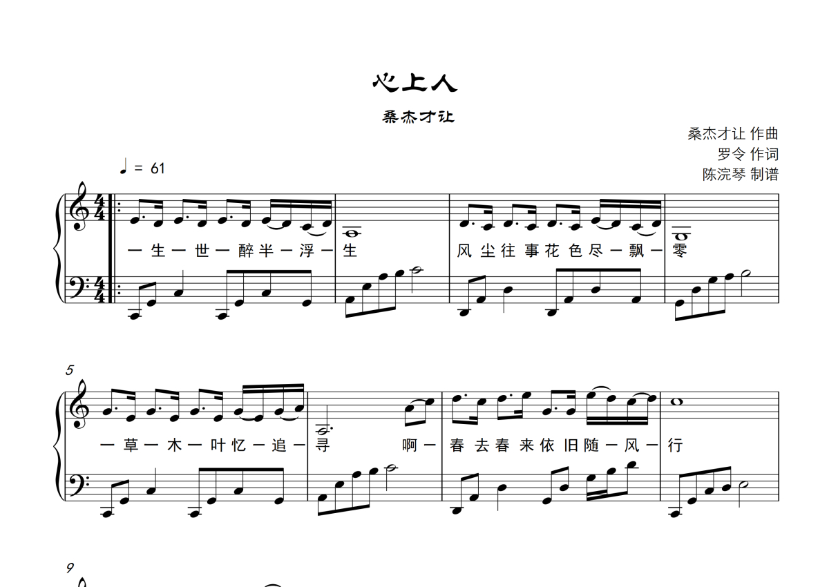 《心上人》是桑杰才让演唱的一首歌曲,C调钢琴谱,附歌词,这份钢琴谱共有两张高清图谱,图谱由 @月隐云先知 编配上传,曲谱配备了相关的音频提供试听,使用这份心上人钢琴谱,可以让你更加方便地掌握这首歌曲的演奏技巧,快来尝试吧。