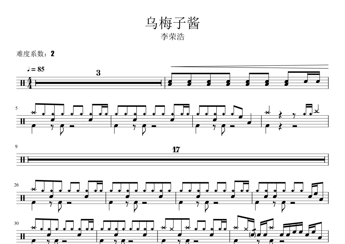 《乌梅子酱》是李荣浩演唱的一首歌曲,这份鼓谱共有两张高清图谱,图谱由 @打鼓谱 编配上传,图谱使用五线谱编配,使用这份乌梅子酱架子鼓谱,你将能够轻松地敲打出这首李荣浩的乌梅子酱,快来尝试吧。李荣浩《乌梅子酱》。
