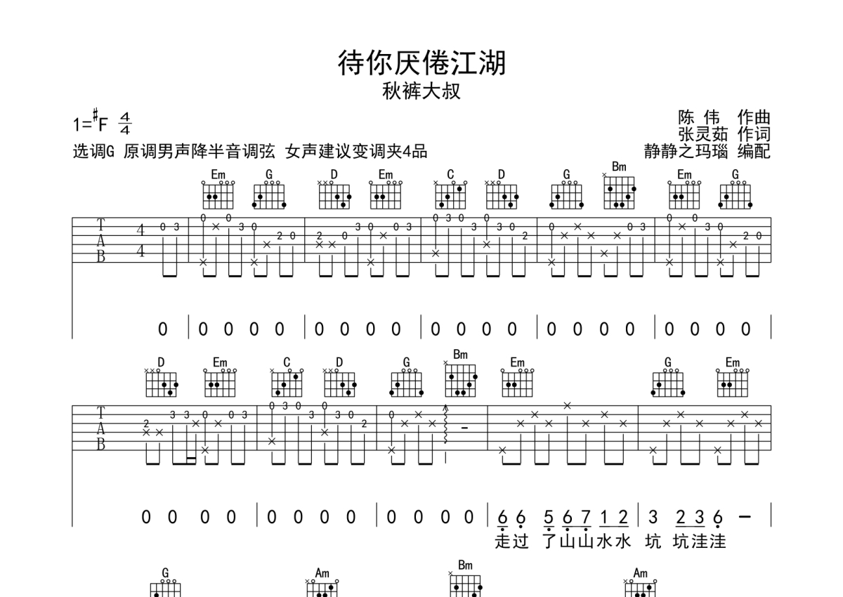 秋裤大叔《待你厌倦江湖》吉他谱 - G调弹唱六线谱