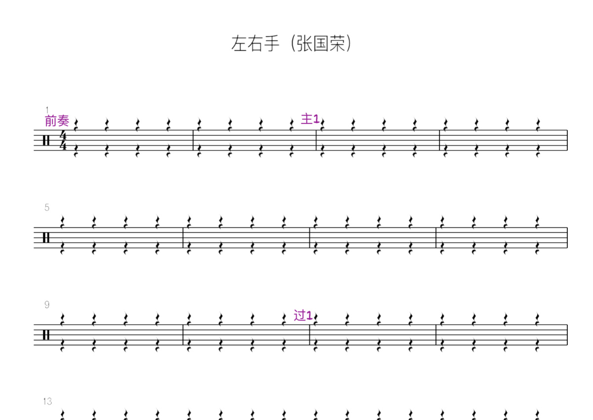 《左右手》是张国荣演唱的一首歌曲,这份鼓谱共有三张高清图谱,图谱由 @打鼓谱 编配上传,图谱使用五线谱编配,使用这份左右手架子鼓谱,你将能够轻松地敲打出这首张国荣的左右手,快来尝试吧。《左右手》是香港著名已故歌手张国荣1999年演唱的歌曲,由林夕作词、叶良俊作曲、唐奕聪编曲。这首歌最初收录在张国荣于1999年10月13日发行的专辑《陪你倒数》中。国语版是《全世界只想你来爱我》。