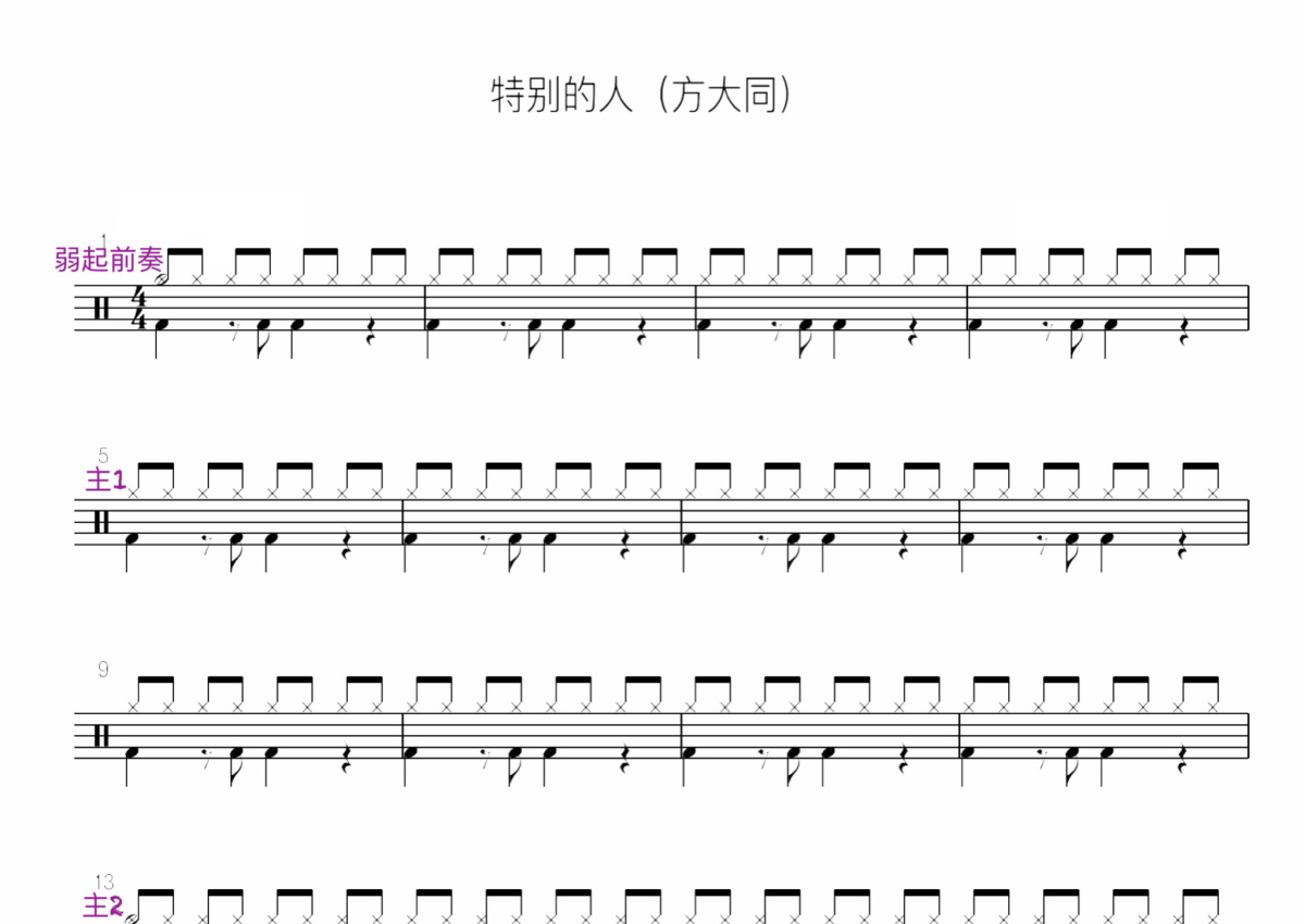 《特别的人》是方大同演唱的一首歌曲,这份鼓谱共有三张高清图谱,图谱由 @打鼓谱 编配上传,图谱使用五线谱编配,使用这份特别的人架子鼓谱,你将能够轻松地敲打出这首方大同的特别的人,快来尝试吧。《特别的人》是方大同填词、谱曲并演唱的一首慢板抒情歌曲,收录于方大同2014年4月11日发行的专辑《危险世界》中。
