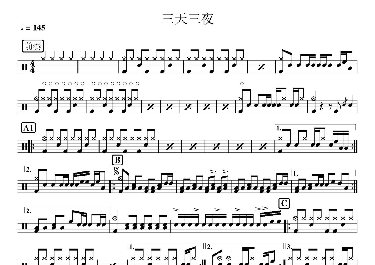《三天三夜》是萧敬腾演唱的一首歌曲,这份鼓谱共有一张高清图谱,图谱由 @打鼓谱 编配上传,图谱使用五线谱编配,使用这份三天三夜架子鼓谱,你将能够轻松地敲打出这首萧敬腾的三天三夜,快来尝试吧。萧敬腾翻唱的歌。