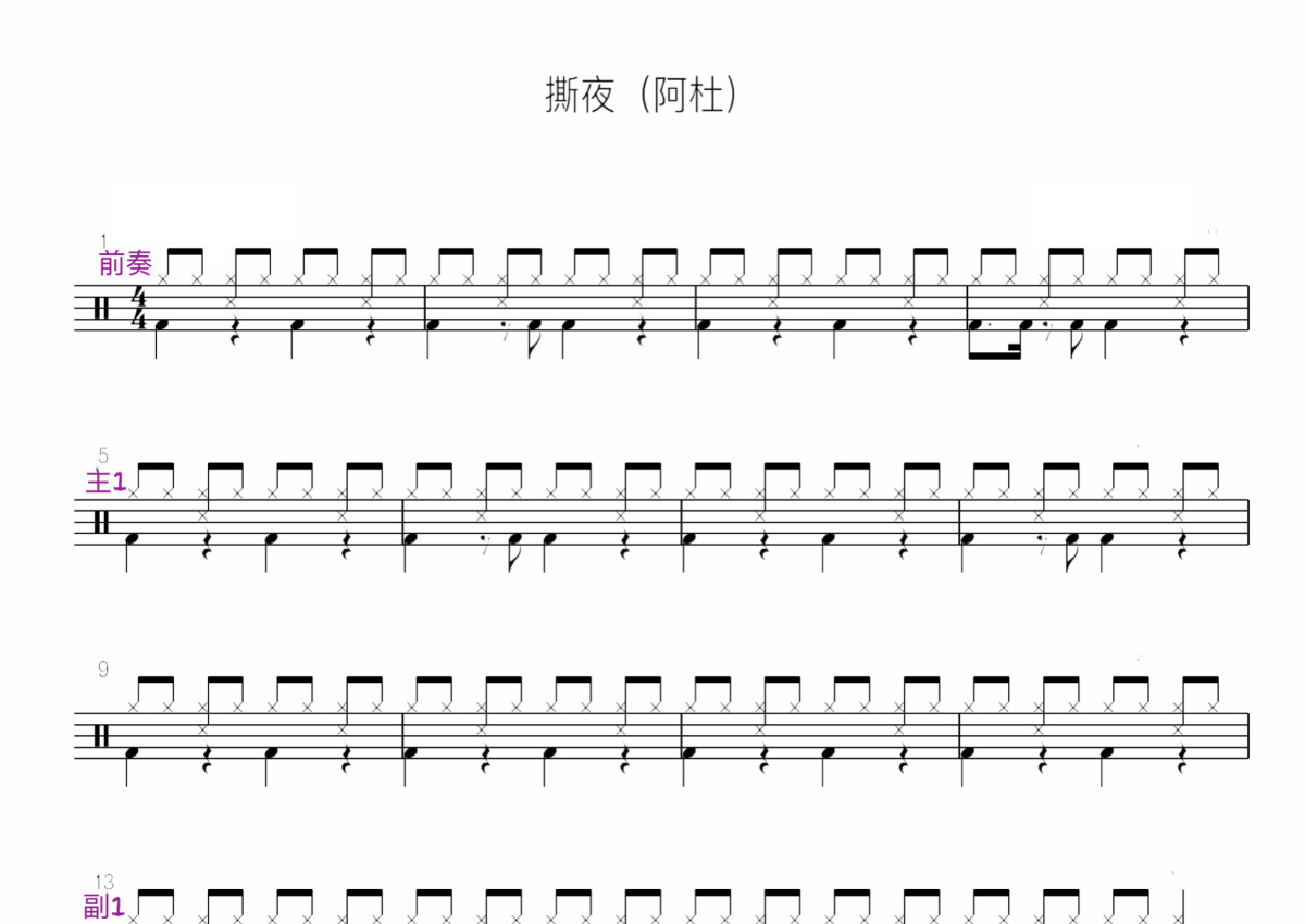 《撕夜》是阿杜演唱的一首歌曲,这份鼓谱共有三张高清图谱,图谱由 @打鼓谱 编配上传,图谱使用五线谱编配,使用这份撕夜架子鼓谱,你将能够轻松地敲打出这首阿杜的撕夜,快来尝试吧。《撕夜》是王武雄作词,蔡政勋作曲,阿杜演唱的一首歌曲,收录在阿杜2002年4月12日发行的首张专辑《天黑》中。