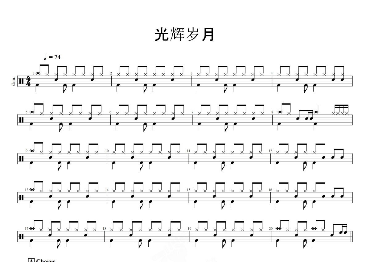 《光辉岁月》是BEYOND演唱的一首歌曲,这份鼓谱共有两张高清图谱,图谱由 @打鼓谱 编配上传,图谱使用五线谱编配,使用这份光辉岁月架子鼓谱,你将能够轻松地敲打出这首BEYOND的光辉岁月,快来尝试吧。香港1990年Beyond演唱歌曲 《光辉岁月》是中国香港摇滚乐队Beyond演唱的一首歌曲,由黄家驹作曲,Beyond编曲 [7] 。该曲分粤语、普通话两个版本,粤语版由黄家驹填词,收录在Beyond1990年9月发行的粤语专辑《命运派对》中 [9] ;普通话版由何启弘、周治平填词,收录在Beyond1991年4月发行的普通话专辑《光辉岁月》中 [8] 。该曲是黄家驹为南非黑人领袖纳尔逊·罗利赫拉赫拉·曼德拉创作的一首作品。 1990年,该曲(粤语版)在1990年度十大劲歌金曲颁奖典礼上获得十大劲。