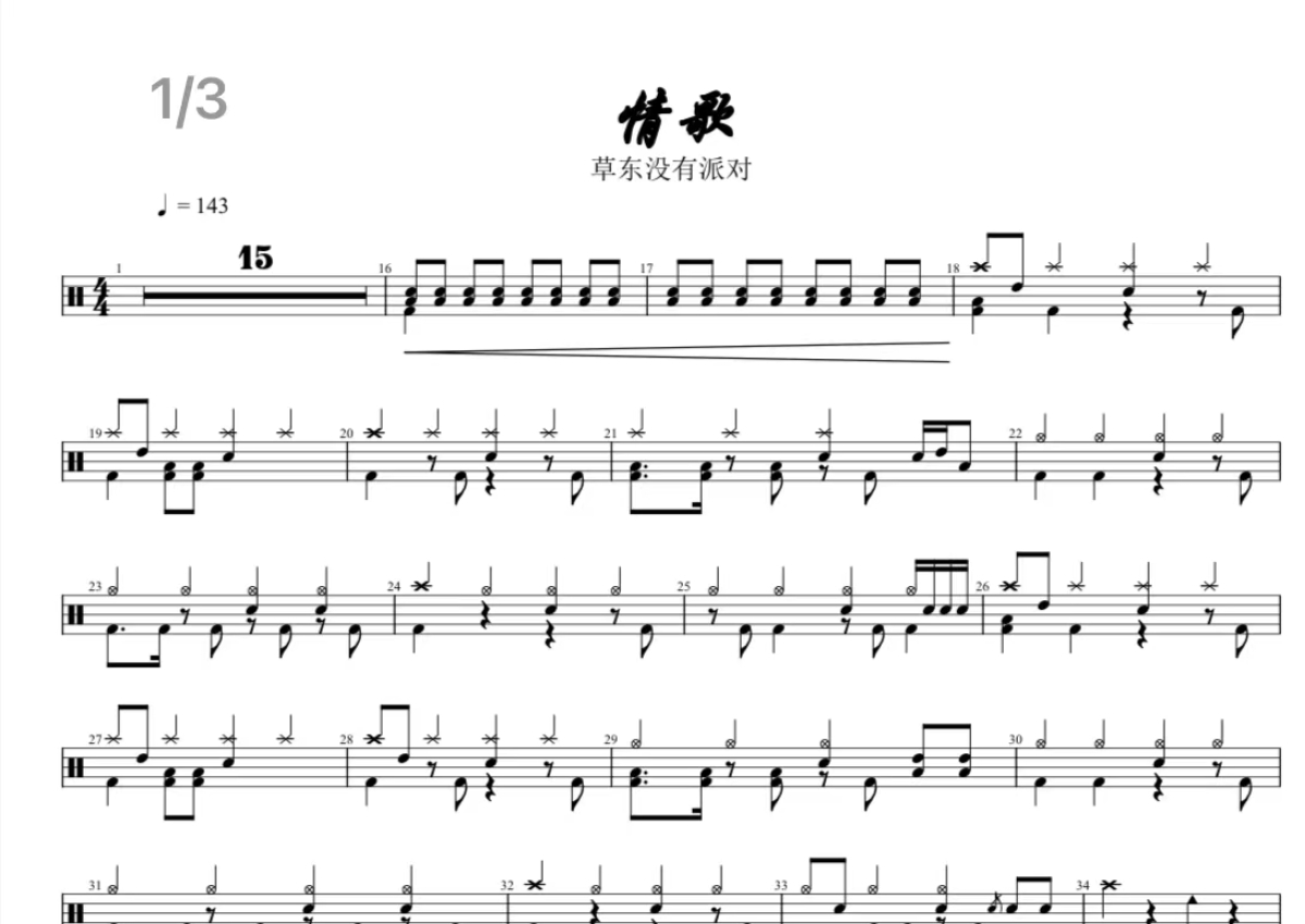 《情歌》是蔡忆凡演唱的一首歌曲,这份鼓谱共有三张高清图谱,图谱由 @打鼓谱 编配上传,图谱使用五线谱编配,使用这份情歌架子鼓谱,你将能够轻松地敲打出这首蔡忆凡的情歌,快来尝试吧。《情歌》是2016年草东没有派对演唱的一首歌曲,收录于专辑《丑奴儿》中。