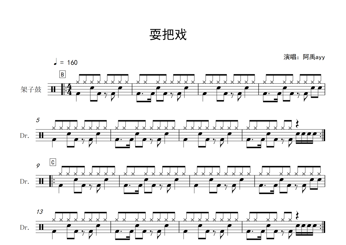 《耍把戏》是阿禹ayy演唱的一首歌曲,这份鼓谱共有两张高清图谱,图谱由 @打鼓谱 编配上传,图谱使用五线谱编配,使用这份耍把戏架子鼓谱,你将能够轻松地敲打出这首阿禹ayy的耍把戏,快来尝试吧。