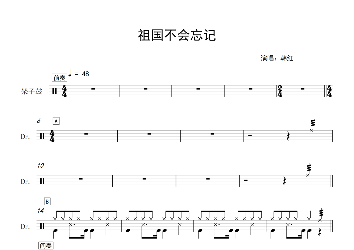 《祖国不会忘记我》是韩红演唱的一首歌曲,这份鼓谱共有一张高清图谱,图谱由 @打鼓谱 编配上传,图谱使用五线谱编配,使用这份祖国不会忘记我架子鼓谱,你将能够轻松地敲打出这首韩红的祖国不会忘记我,快来尝试吧。