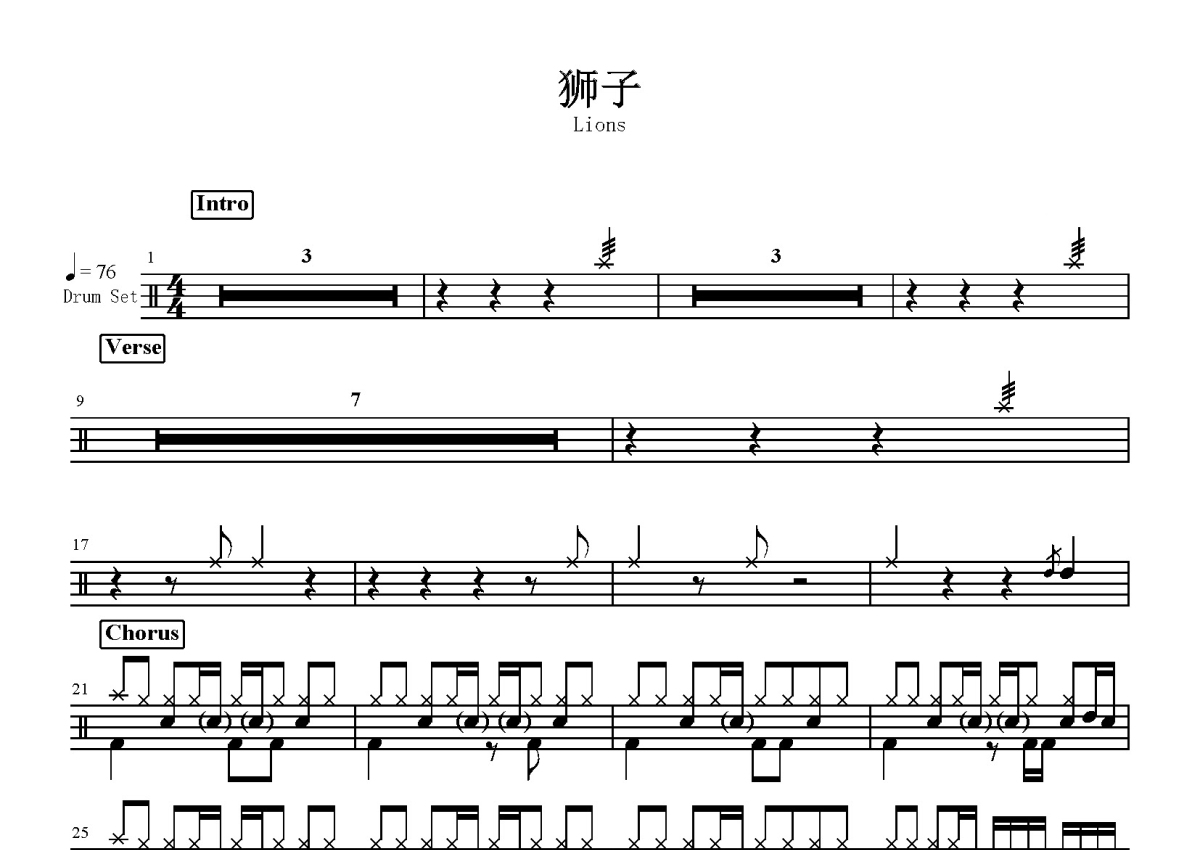 Lion《狮子》鼓谱 - 架子鼓谱