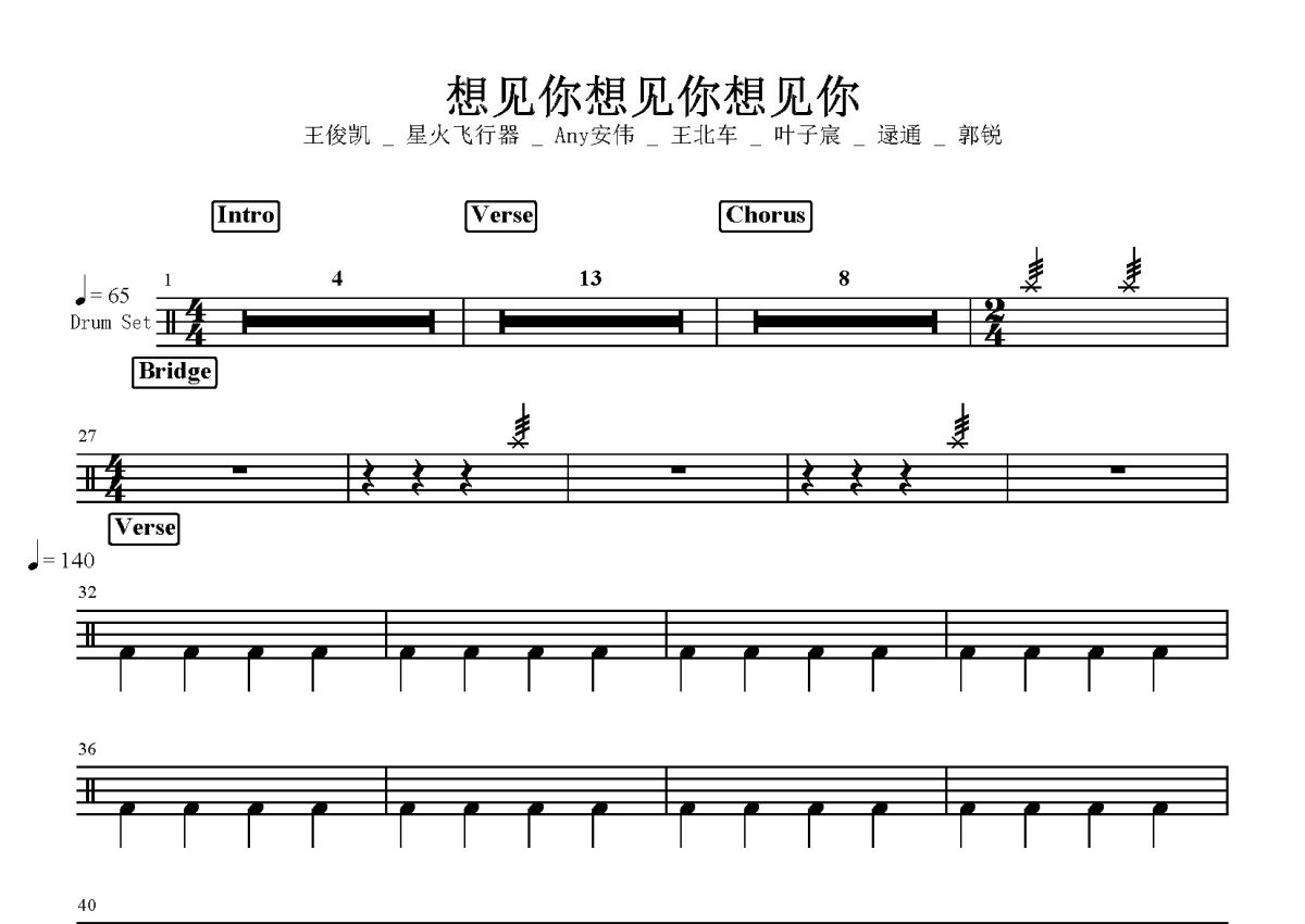 王俊凯 _ 星火飞行器 _ Any安伟 _ 王北车 _ 叶子宸 _ 逯通 _ 郭锐《想见你想见你想见你》鼓谱 - 架子鼓谱