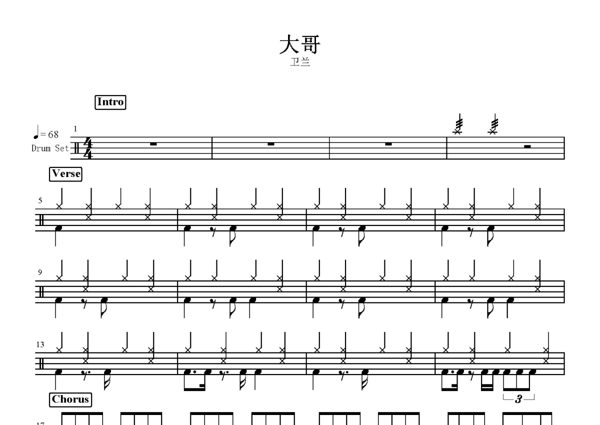《大哥》是卫兰演唱的一首歌曲,这份鼓谱共有两张高清图谱,图谱由 @打鼓谱 编配上传,图谱使用五线谱编配,使用这份大哥架子鼓谱,你将能够轻松地敲打出这首卫兰的大哥,快来尝试吧。卫兰 - 大哥。