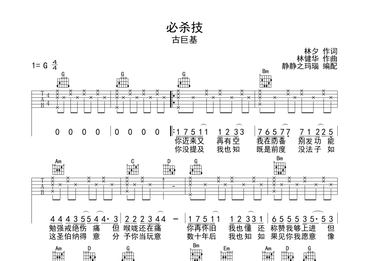 《必杀技》是古巨基演唱的一首歌曲,本吉他谱采用的是G调指法编配,这份吉他谱共有两张高清图谱,图谱由 @静待花开 编配上传,图谱使用六线谱编配,包含吉他和弦指法、简谱以及歌词部分,使用这份必杀技吉他谱,可以让你更加方便地掌握这首歌曲的弹唱技巧,快来尝试吧。必杀技G调吉他谱。