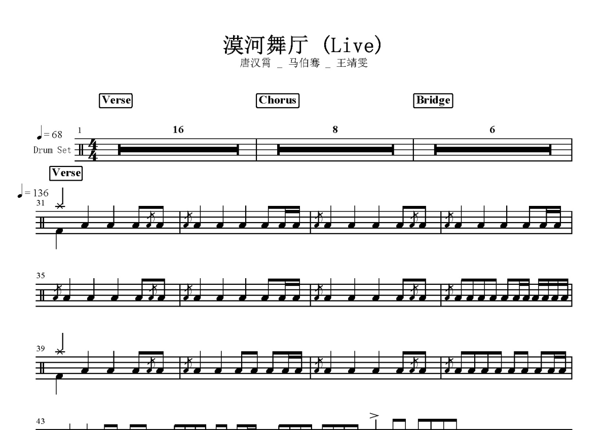 唐汉霄 _ 马伯骞 _ 王靖雯《漠河舞厅》鼓谱 - 架子鼓谱