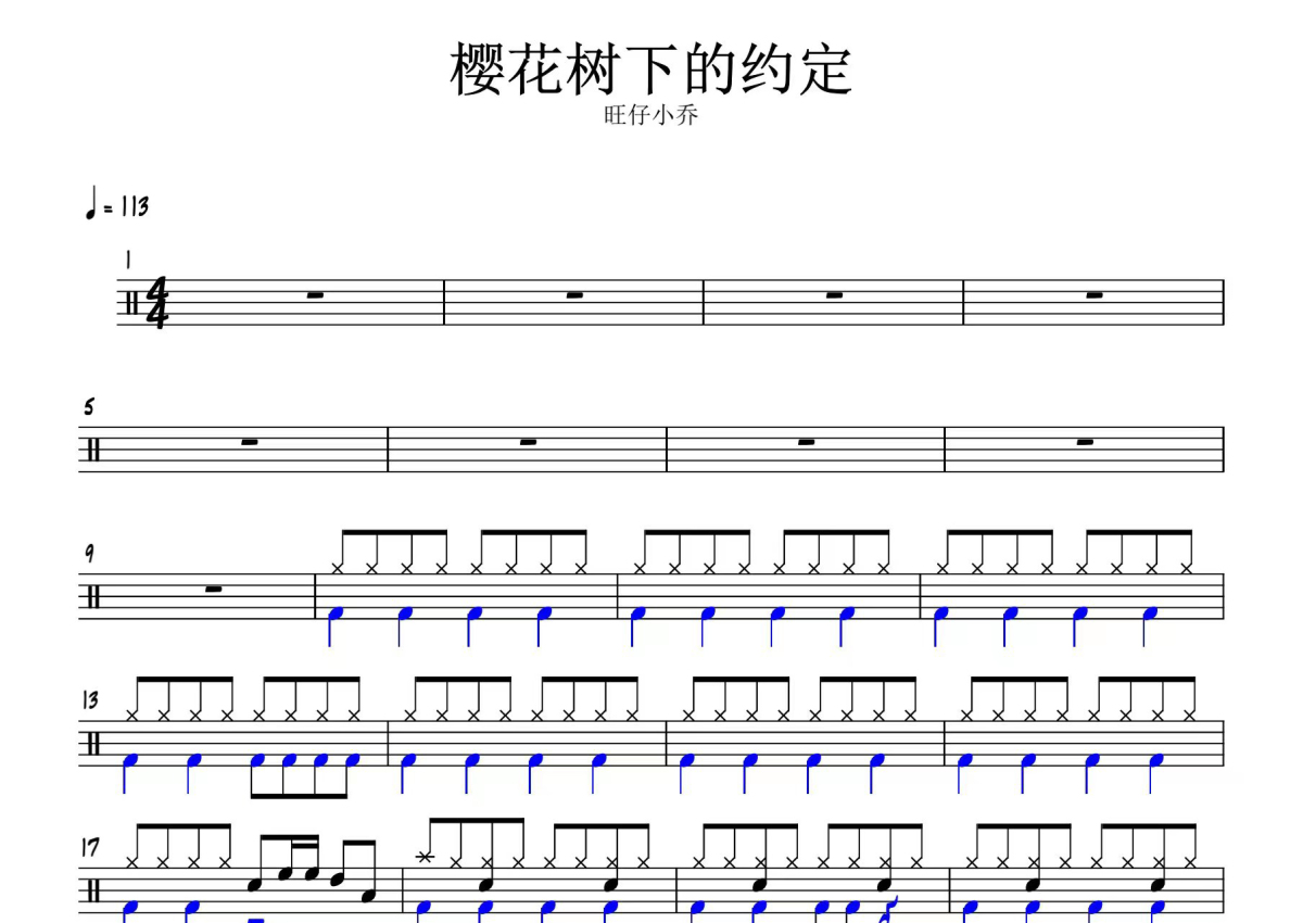 《樱花树下的约定》是旺仔小乔演唱的一首歌曲,这份鼓谱共有两张高清图谱,图谱由 @打鼓谱 编配上传,图谱使用五线谱编配,使用这份樱花树下的约定架子鼓谱,你将能够轻松地敲打出这首旺仔小乔的樱花树下的约定,快来尝试吧。《樱花树下的约定》是旺仔小乔演唱的单曲,发行于2022年4月27日,收录于专辑《樱花树下的约定》中。