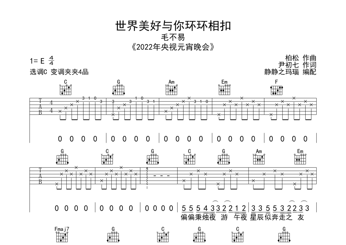 毛不易《世间美好与你环环相扣》吉他谱 - C调弹唱六线谱
