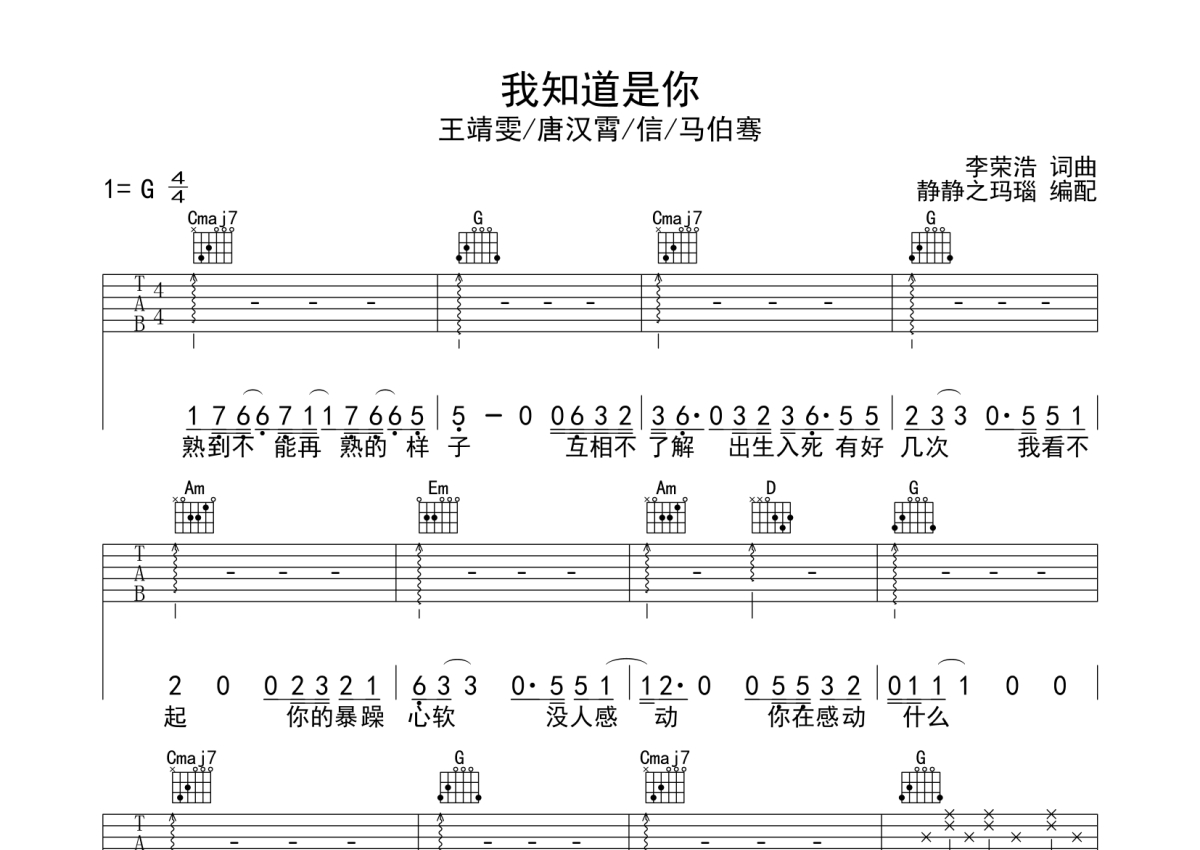 王靖雯/唐汉霄/信/马伯骞《我知道是你》吉他谱 - G调弹唱六线谱