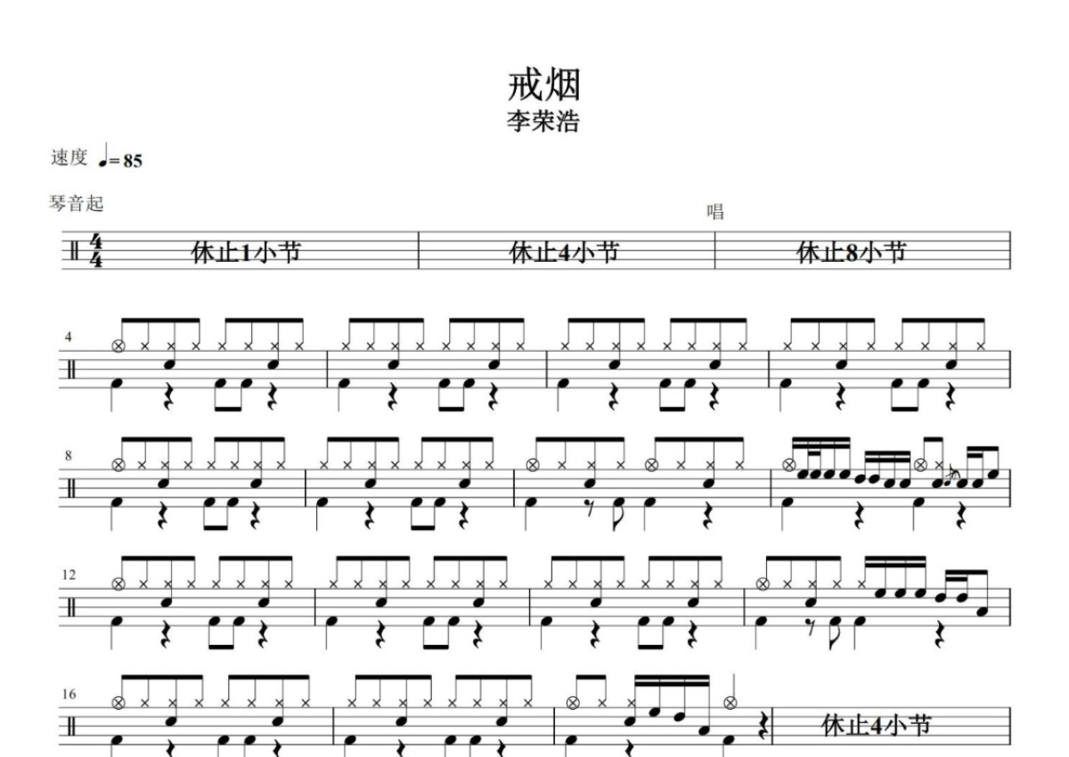 《戒烟》是李荣浩演唱的一首歌曲,这份鼓谱共有两张高清图谱,图谱由 @打鼓谱 编配上传,图谱使用五线谱编配,使用这份戒烟架子鼓谱,你将能够轻松地敲打出这首李荣浩的戒烟,快来尝试吧。该用户很懒,什么也没有留下~。