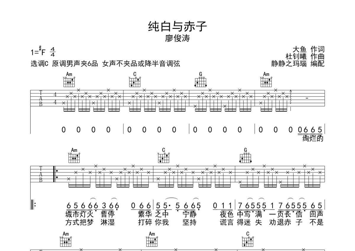 廖俊涛《纯白与赤子》吉他谱 - C调弹唱六线谱