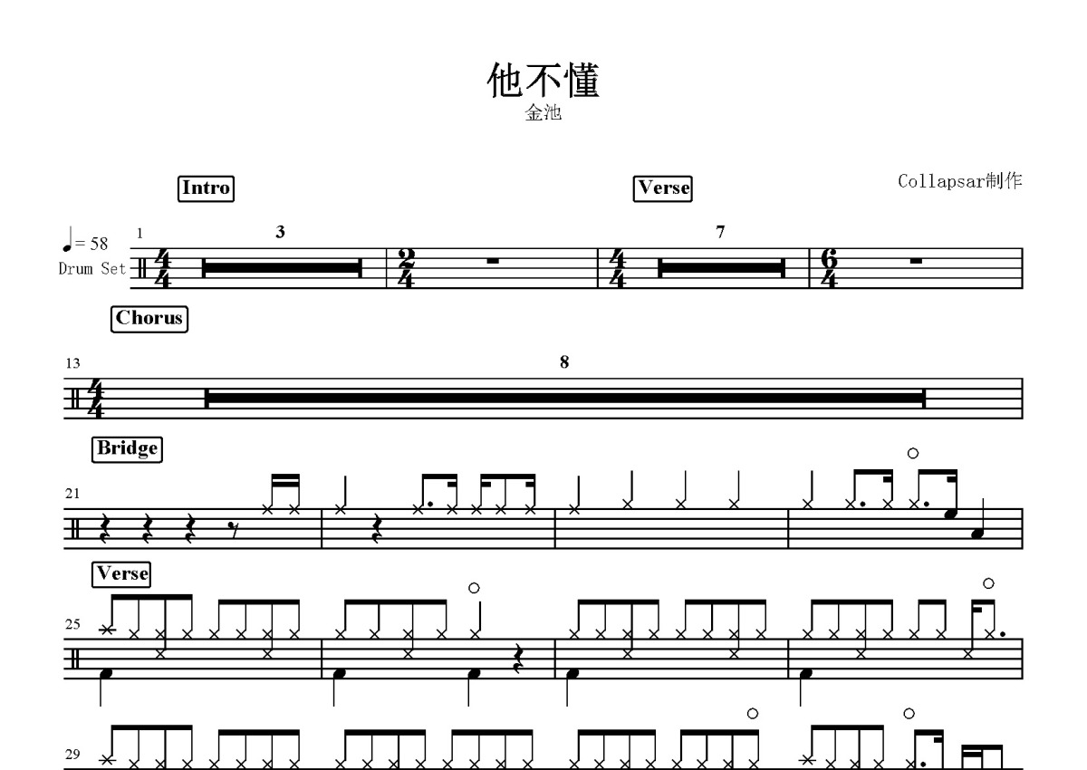 金池《他不懂》鼓谱 - 架子鼓谱