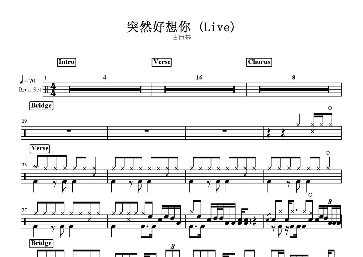 《突然好想你》是古巨基演唱的一首歌曲,这份鼓谱共有一张高清图谱,图谱由 @打鼓谱 编配上传,图谱使用五线谱编配,使用这份突然好想你架子鼓谱,你将能够轻松地敲打出这首古巨基的突然好想你,快来尝试吧。古巨基 - 突然好想你 (Live)。