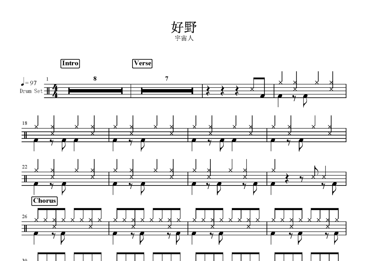 宇宙人《好野》鼓谱 - 架子鼓谱
