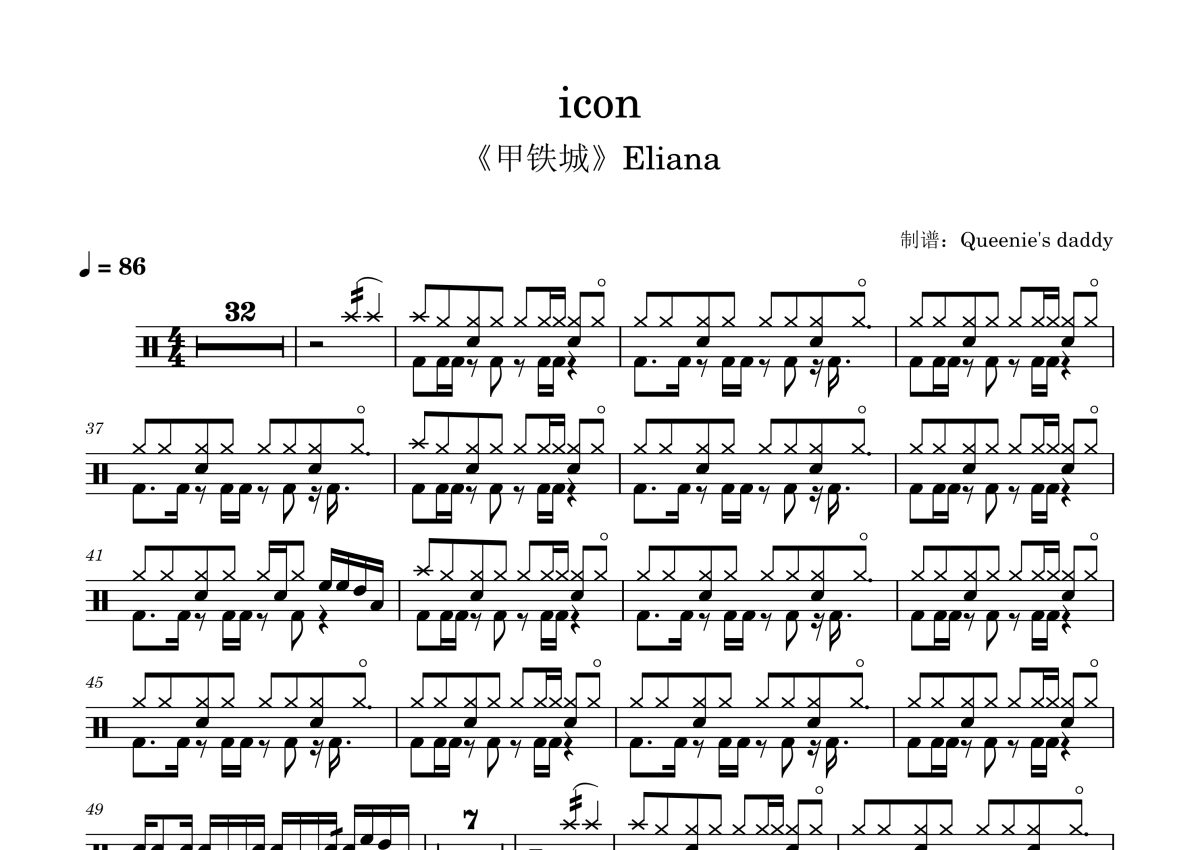 《ICON(甲铁城 Eliana曲)》是Eliana演唱的一首歌曲,这份鼓谱共有两张高清图谱,图谱由 @打鼓谱 编配上传,图谱使用五线谱编配,使用这份ICON(甲铁城 Eliana曲)架子鼓谱,你将能够轻松地敲打出这首Eliana的ICON(甲铁城 Eliana曲),快来尝试吧。「icon」为抒情曲,由擅长 R&B 的 Eliana 演唱,「icon」和动画的 ED 「ninelie」 旋律是一样的,「icon」是英文版,而「ninelie」就是「icon」日文版由Aimer 和 chelly 演唱。