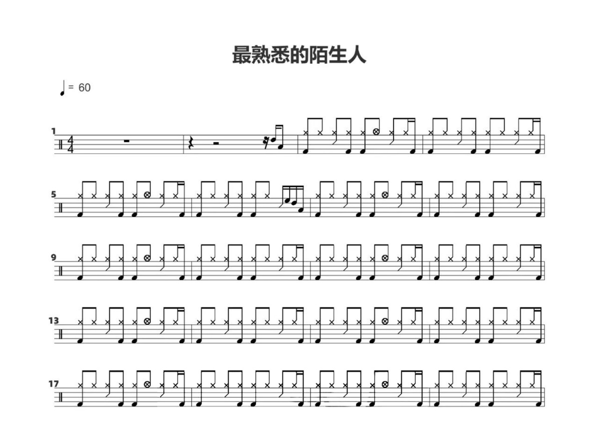 《最熟悉的陌生人》是萧亚轩演唱的一首歌曲,这份鼓谱共有两张高清图谱,图谱由 @打鼓谱 编配上传,图谱使用五线谱编配,使用这份最熟悉的陌生人架子鼓谱,你将能够轻松地敲打出这首萧亚轩的最熟悉的陌生人,快来尝试吧。《最熟悉的陌生人》是华语流行乐女歌手萧亚轩演唱的一首中慢板抒情歌,这首歌由姚谦填词,小柯谱曲,收录于萧亚轩1999年11月17日发行的个人首张专辑《萧亚轩》中,亦是专辑的主打歌之一。
