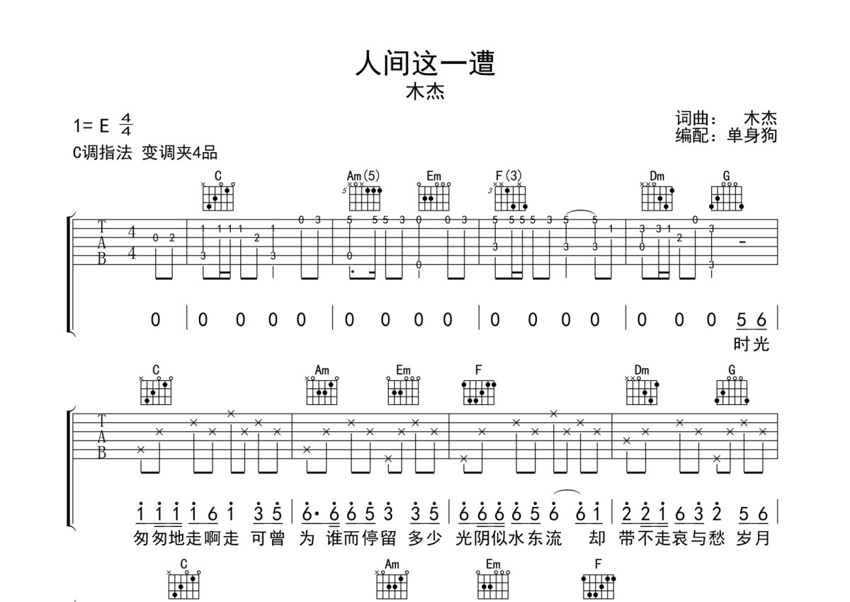 木杰《人间这一遭》吉他谱 - C调弹唱六线谱