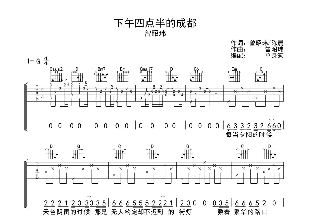 曾昭玮《下午四点半的成都》吉他谱 - G调弹唱六线谱