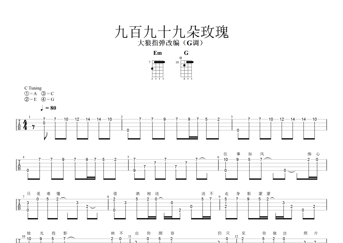 《九百九十九朵玫瑰》是邰正宵演唱的一首歌曲,简易版,本尤克里里谱采用的是G调指法编配,这份尤克里里谱共有两张高清图谱,图谱由 @大狼指弹 编配上传,图谱使用四线谱编配,曲谱配备了相关的音频提供试听,使用这份九百九十九朵玫瑰尤克里里谱,可以让你更加方便地掌握这首歌曲的演奏技巧,快来尝试吧。九百九十九朵玫瑰尤克里里指弹独奏谱,G调指法,适合初学者。
