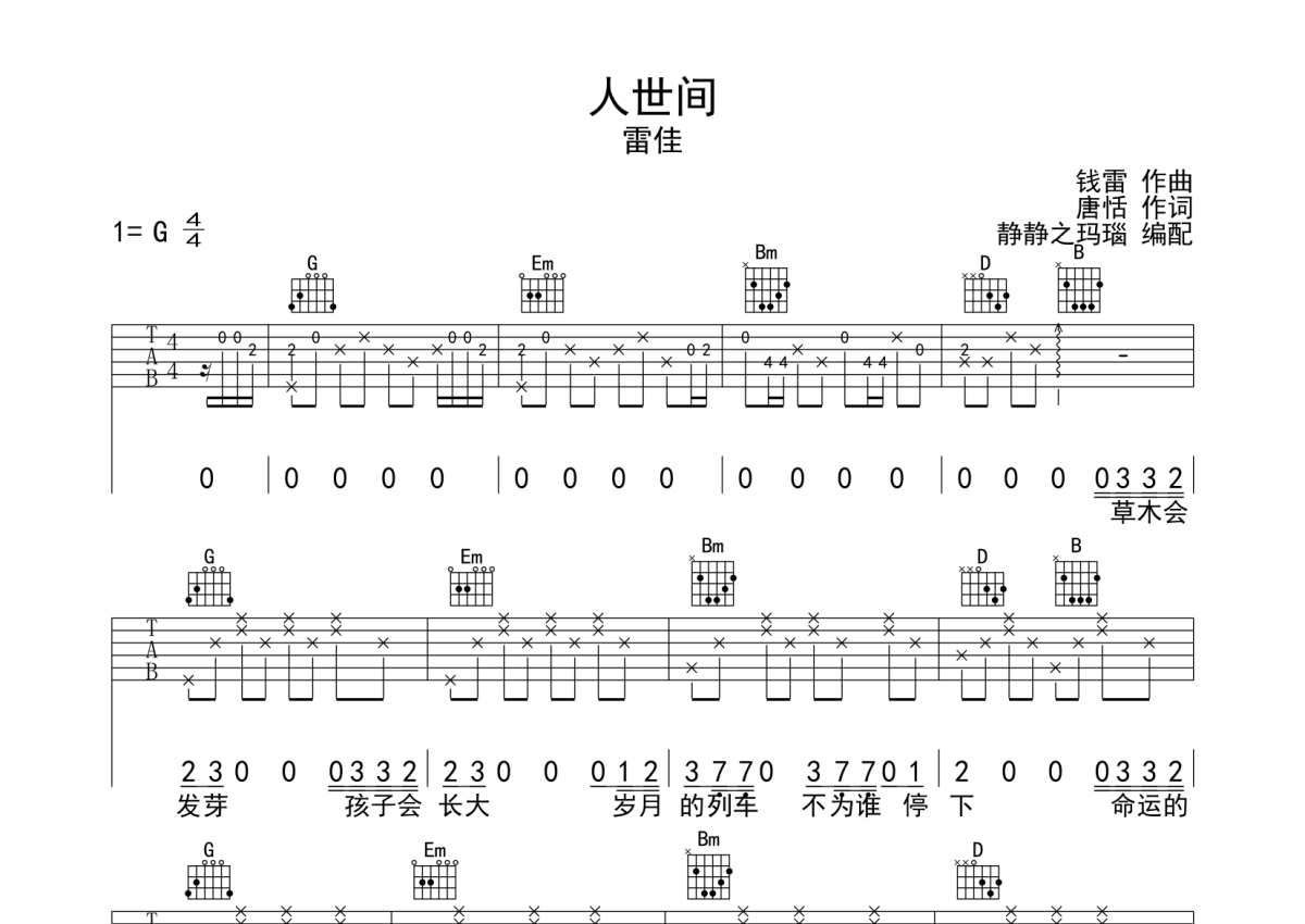 雷佳《人世间》吉他谱 - G调弹唱六线谱